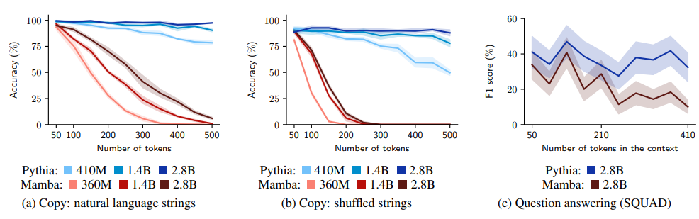 Copy: shuffled strings. To test whether it mattered that the strings were in natural language, randomly shuffle the word order of the strings from the previous experiment. it was found that this degrades performance, especially for the Mamba models.